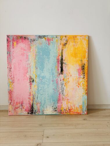 The canvas is a kaleidoscope of colors, infused with vibrant energy and life. Yet, despite the riot of colors, there’s a subtle harmony at play. The texture of the painting adds depth, inviting to run fingers over its surface.