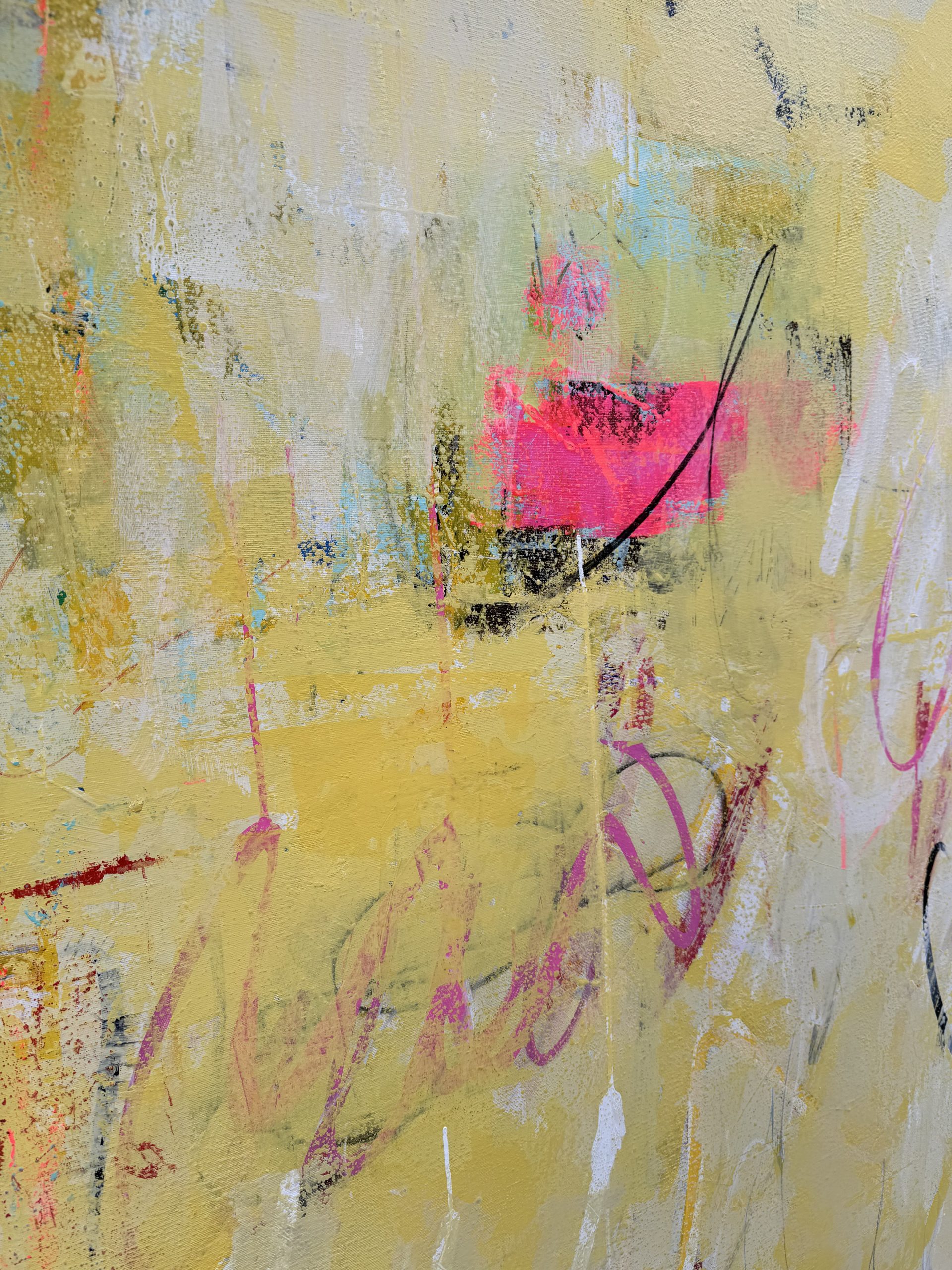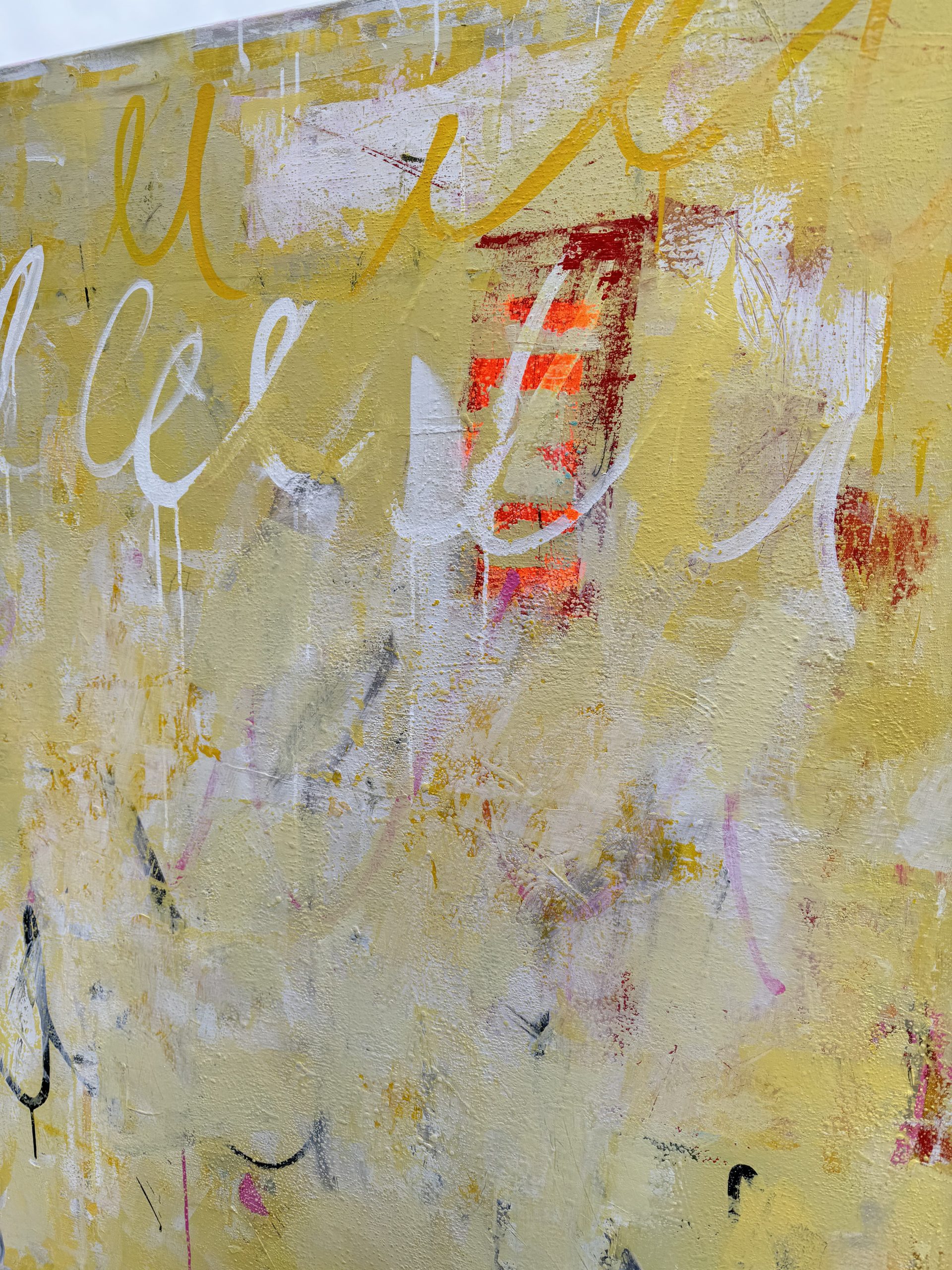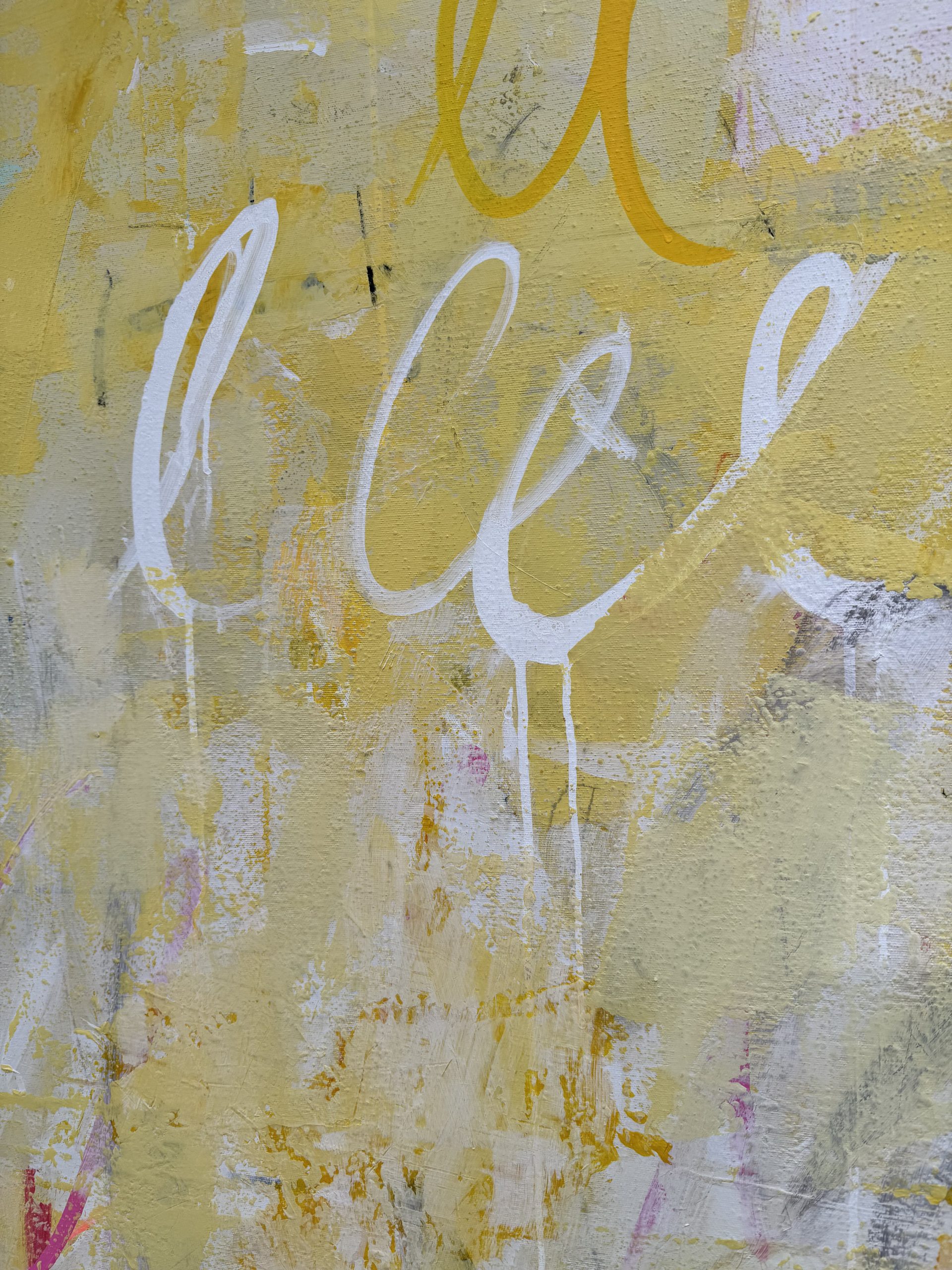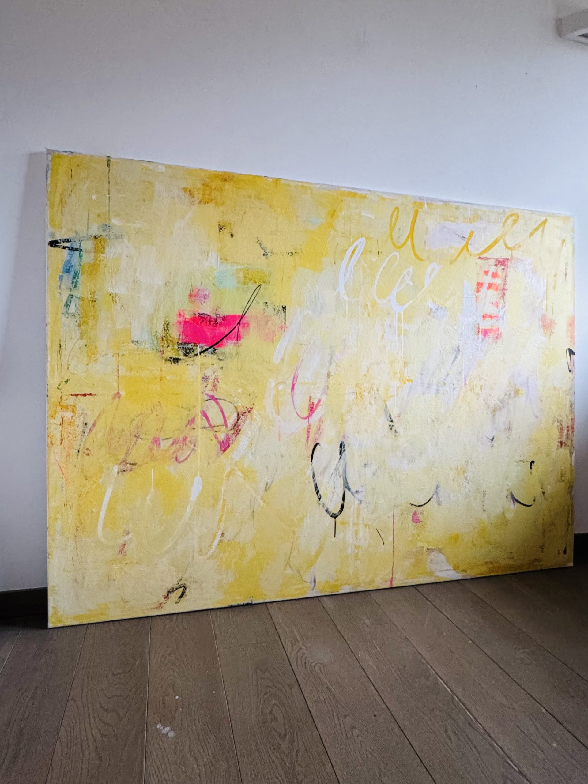 At the top, a band of airy, handwriting-like gestures creates a floating, atmospheric feeling — like fresh air entering a room. The yellow field beneath holds traces of earlier decisions: marks added, softened, rewritten, creating depth and a sense of mystery. From up close, the surface reveals subtle scratches, small bursts of pink, and dark grounding gestures, all woven into a coherent whole.