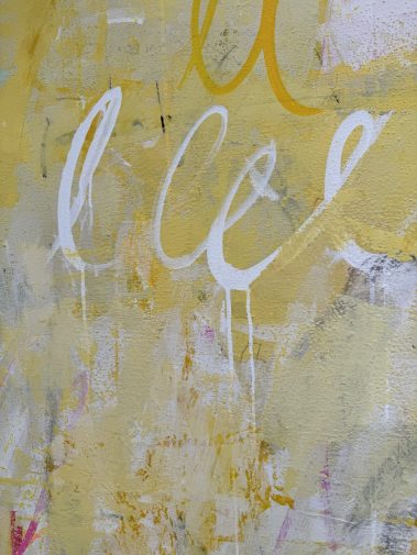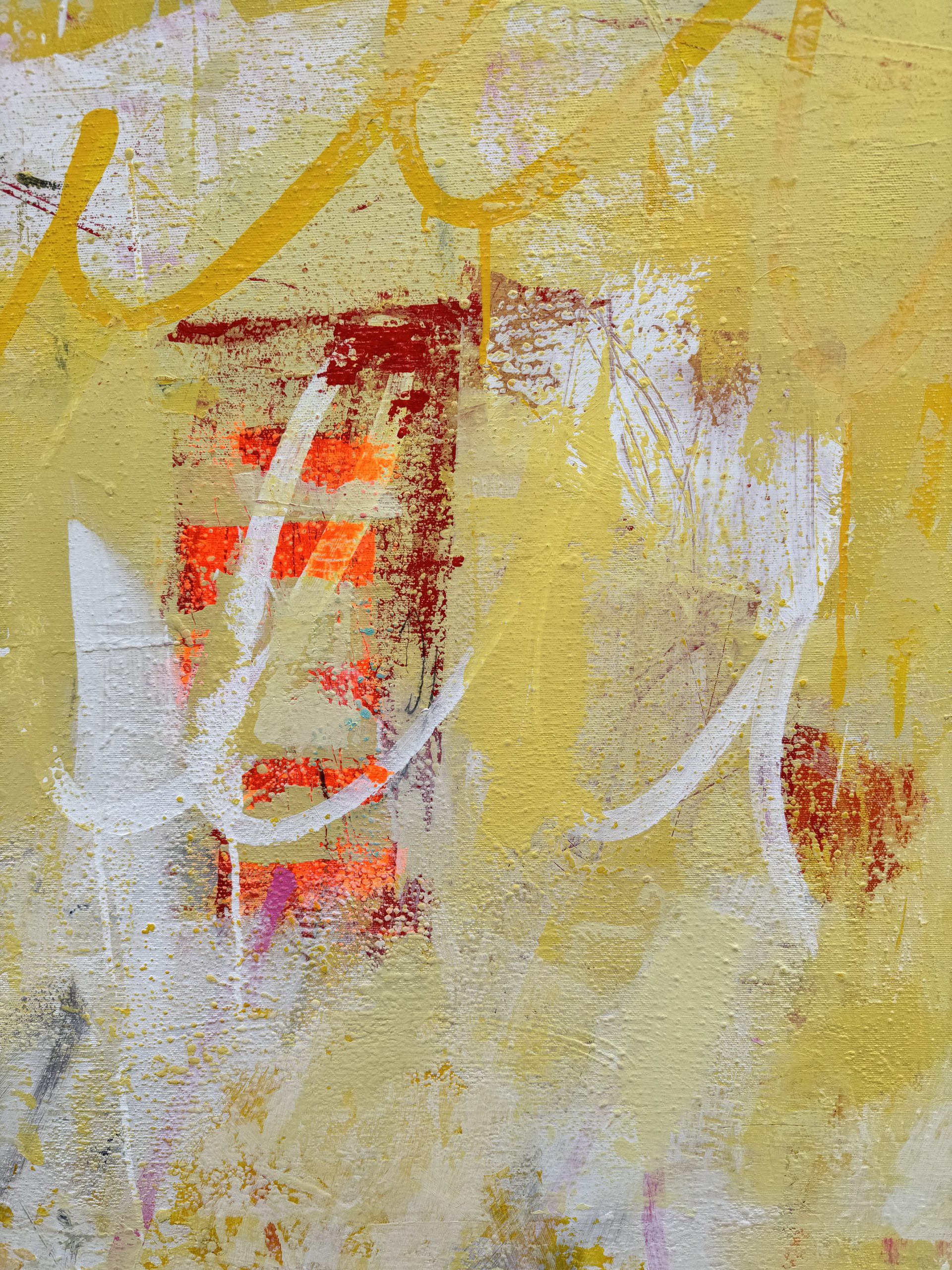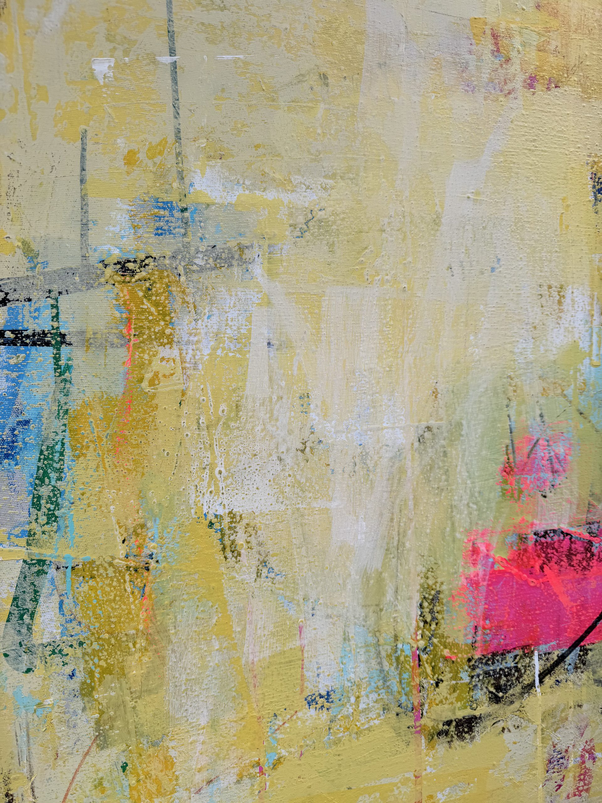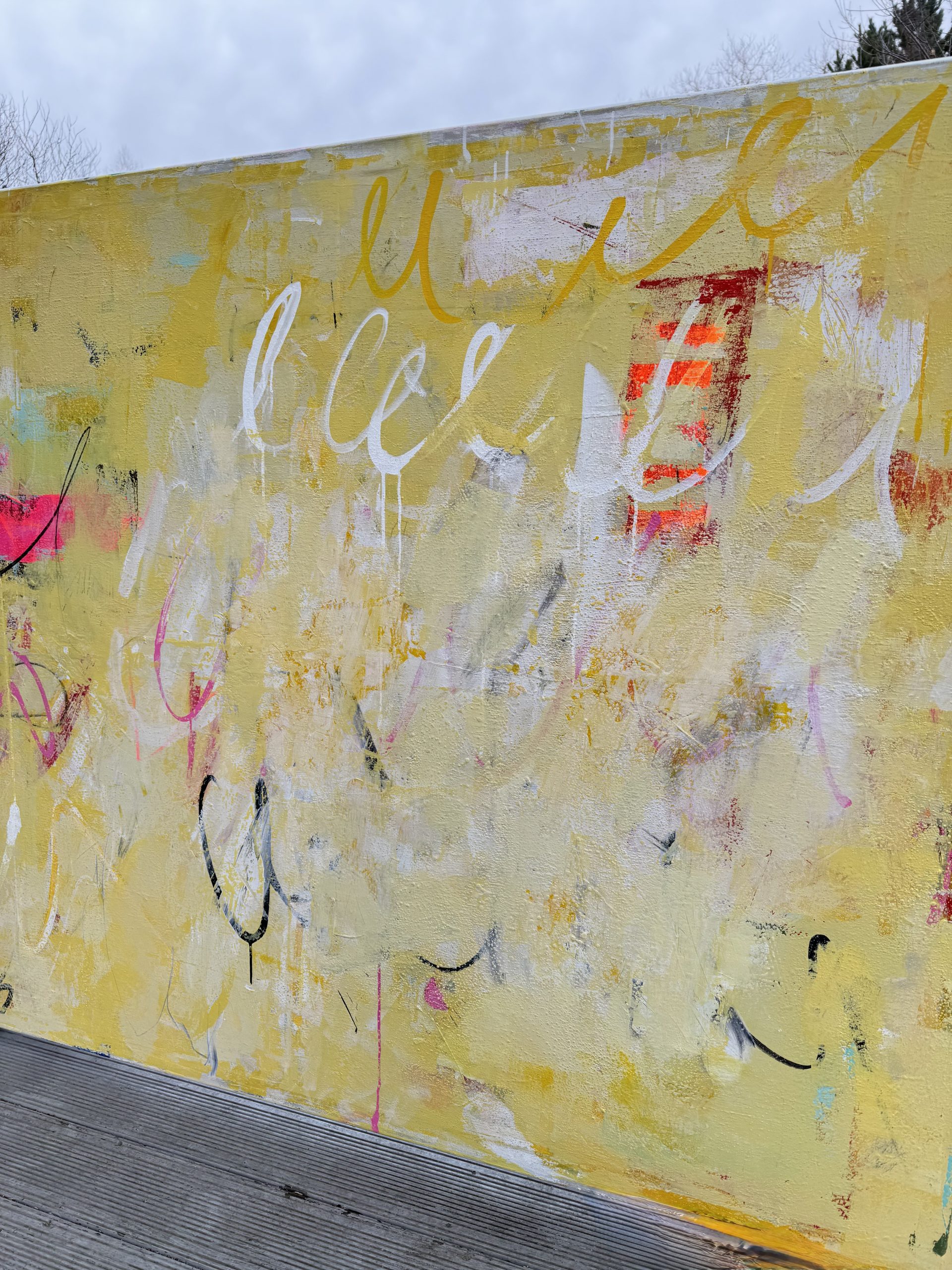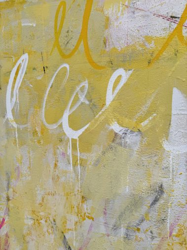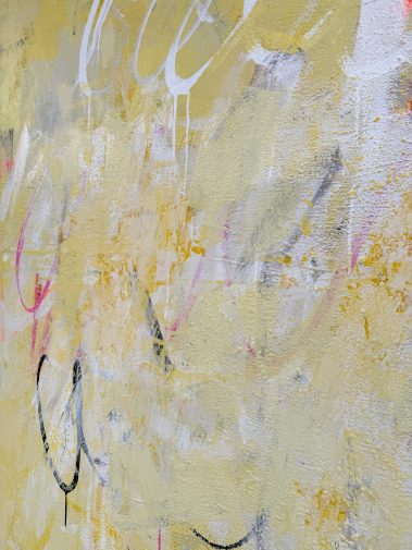 At the top, a band of airy, handwriting-like gestures creates a floating, atmospheric feeling — like fresh air entering a room. The yellow field beneath holds traces of earlier decisions: marks added, softened, rewritten, creating depth and a sense of mystery. From up close, the surface reveals subtle scratches, small bursts of pink, and dark grounding gestures, all woven into a coherent whole.