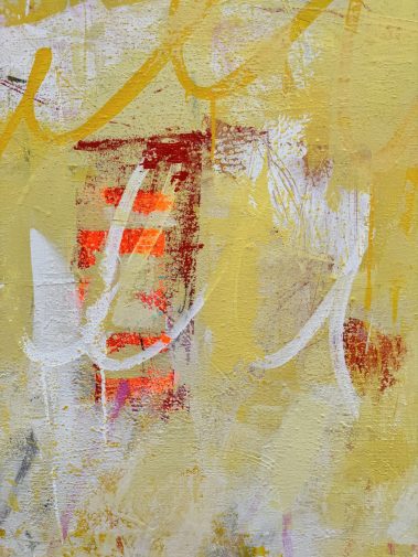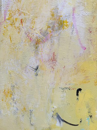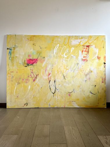 ‘Dancing With the Windows Open’, by Flavia Birsan, is a luminous abstract work built through multiple layers of acrylic, soft erasures and gestural marks. The painting unfolds in warm yellow tones, drifting whites and vibrant accents that bring movement and light into the composition.