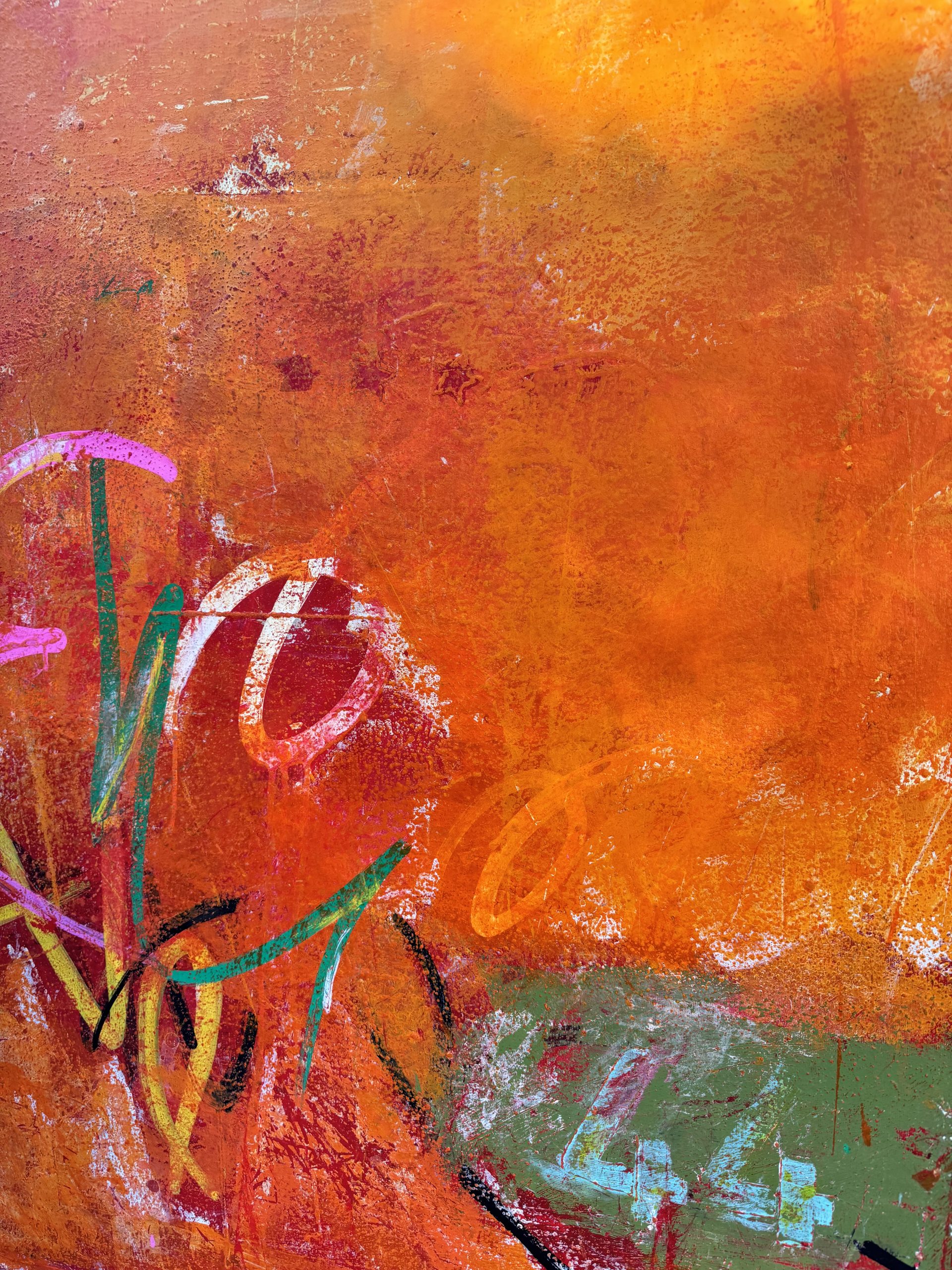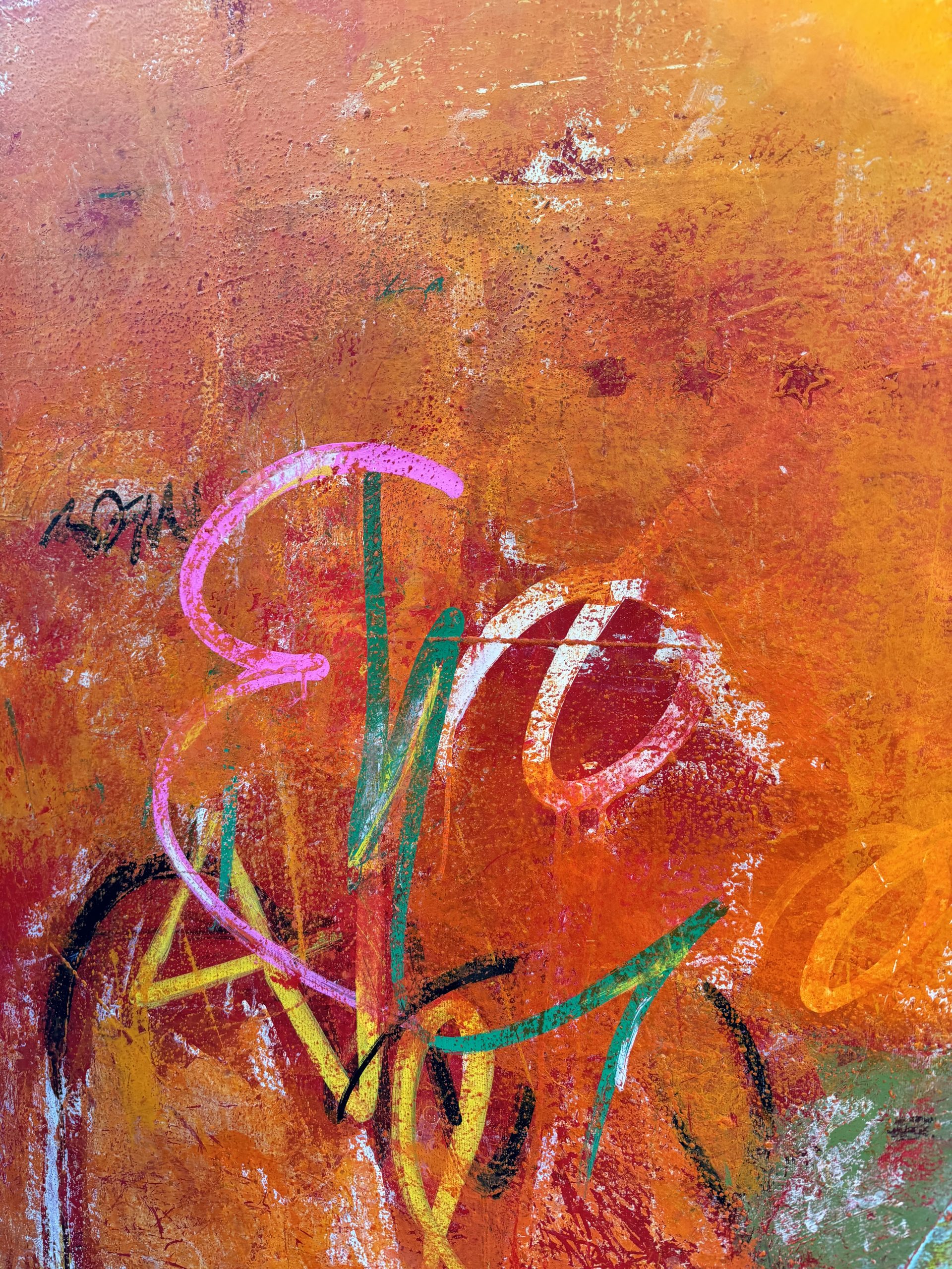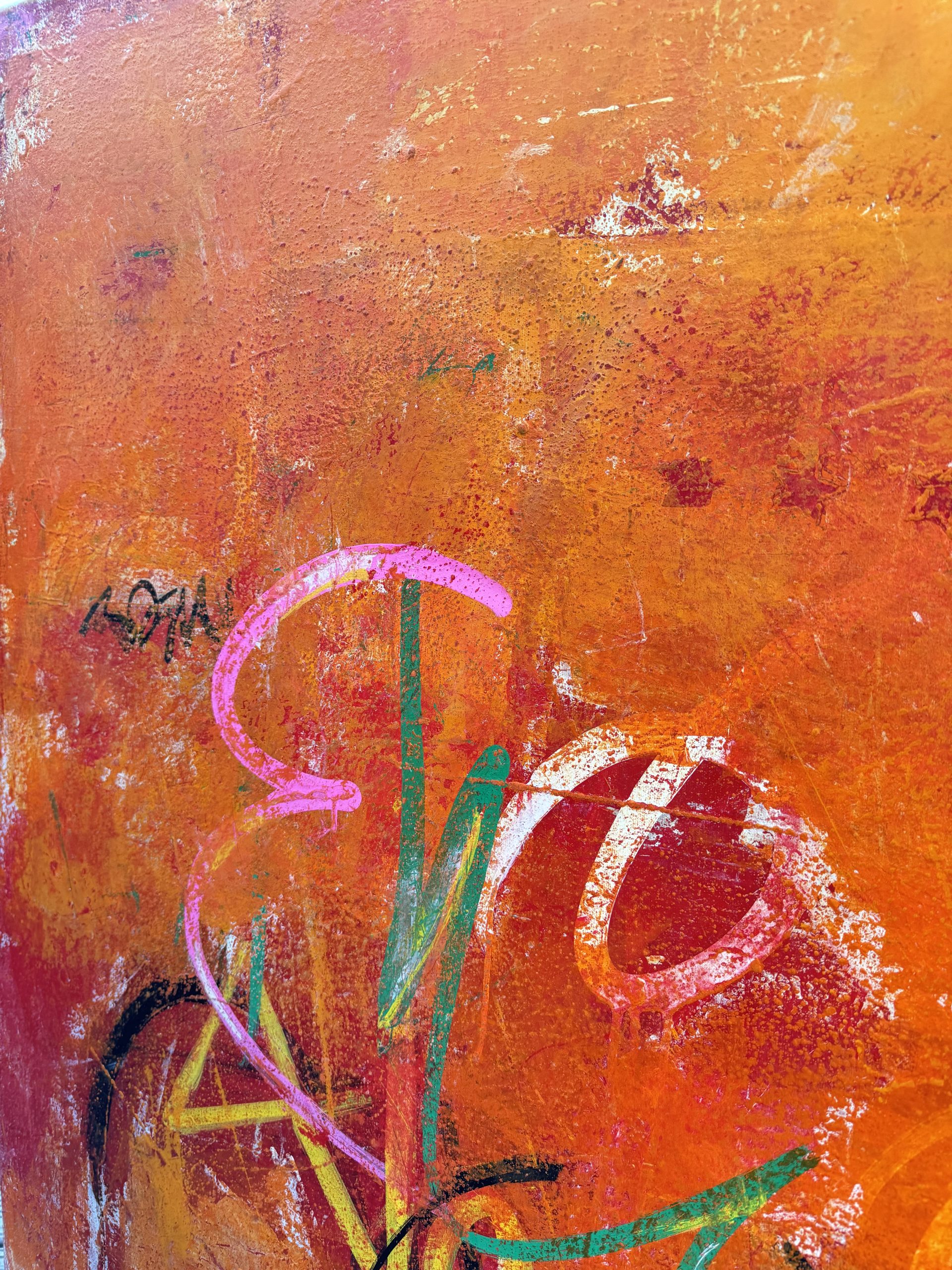 This piece blends warm oranges, dusty pinks and the lingering red of the underpainting with a single green area acting like a window or a door. Graffiti-like marks run across the surface, spontaneous and unpolished, recalling summer afternoons spent on a balcony looking at a wall full of colour and stories.