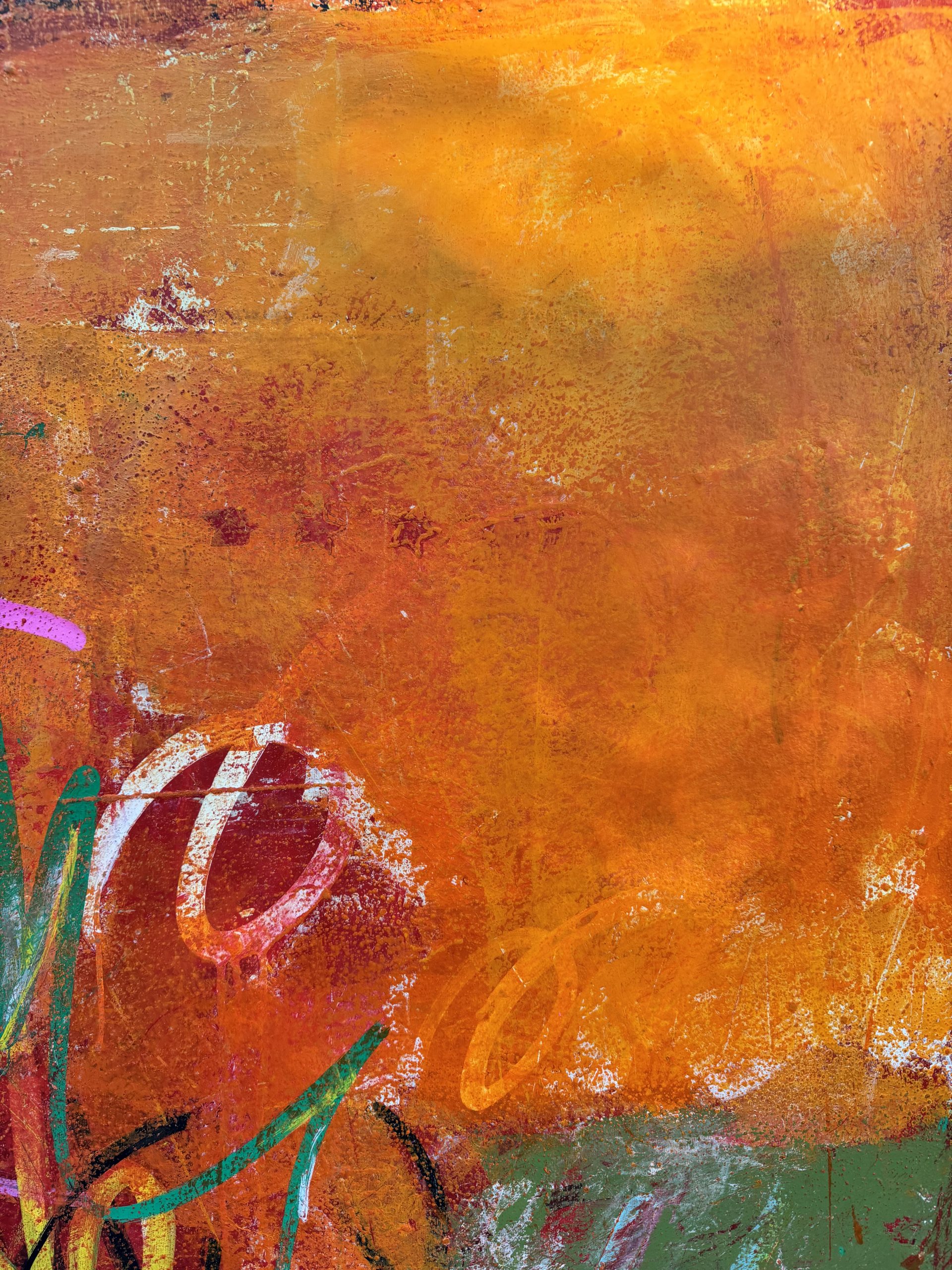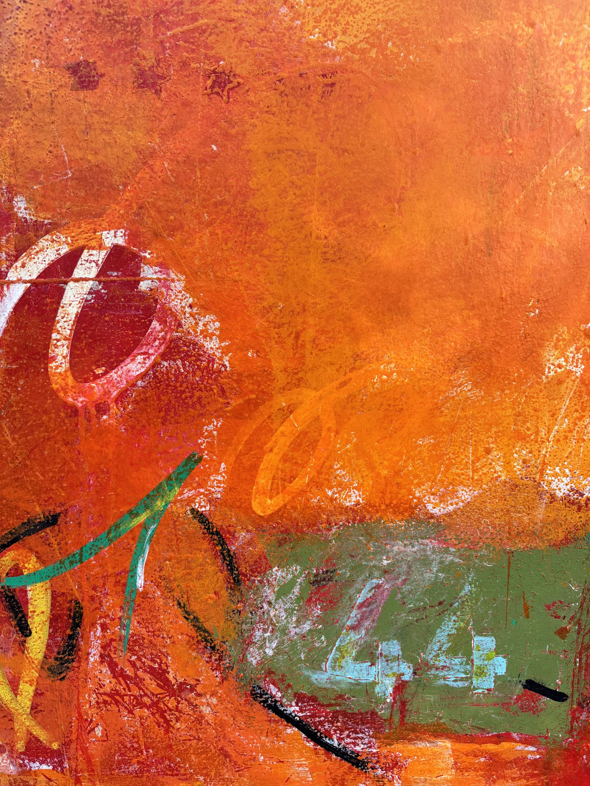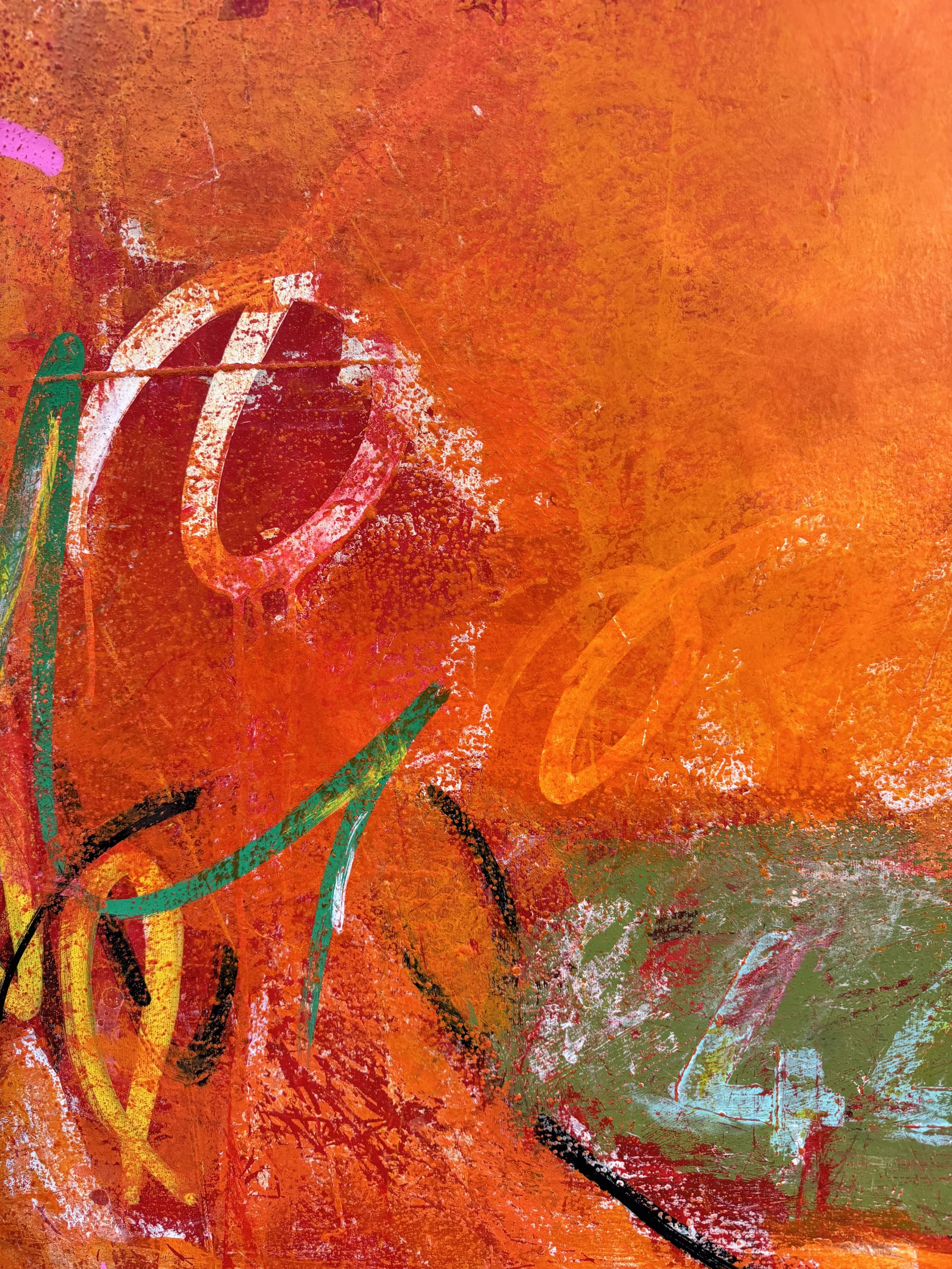 This piece blends warm oranges, dusty pinks and the lingering red of the underpainting with a single green area acting like a window or a door. Graffiti-like marks run across the surface, spontaneous and unpolished, recalling summer afternoons spent on a balcony looking at a wall full of colour and stories.