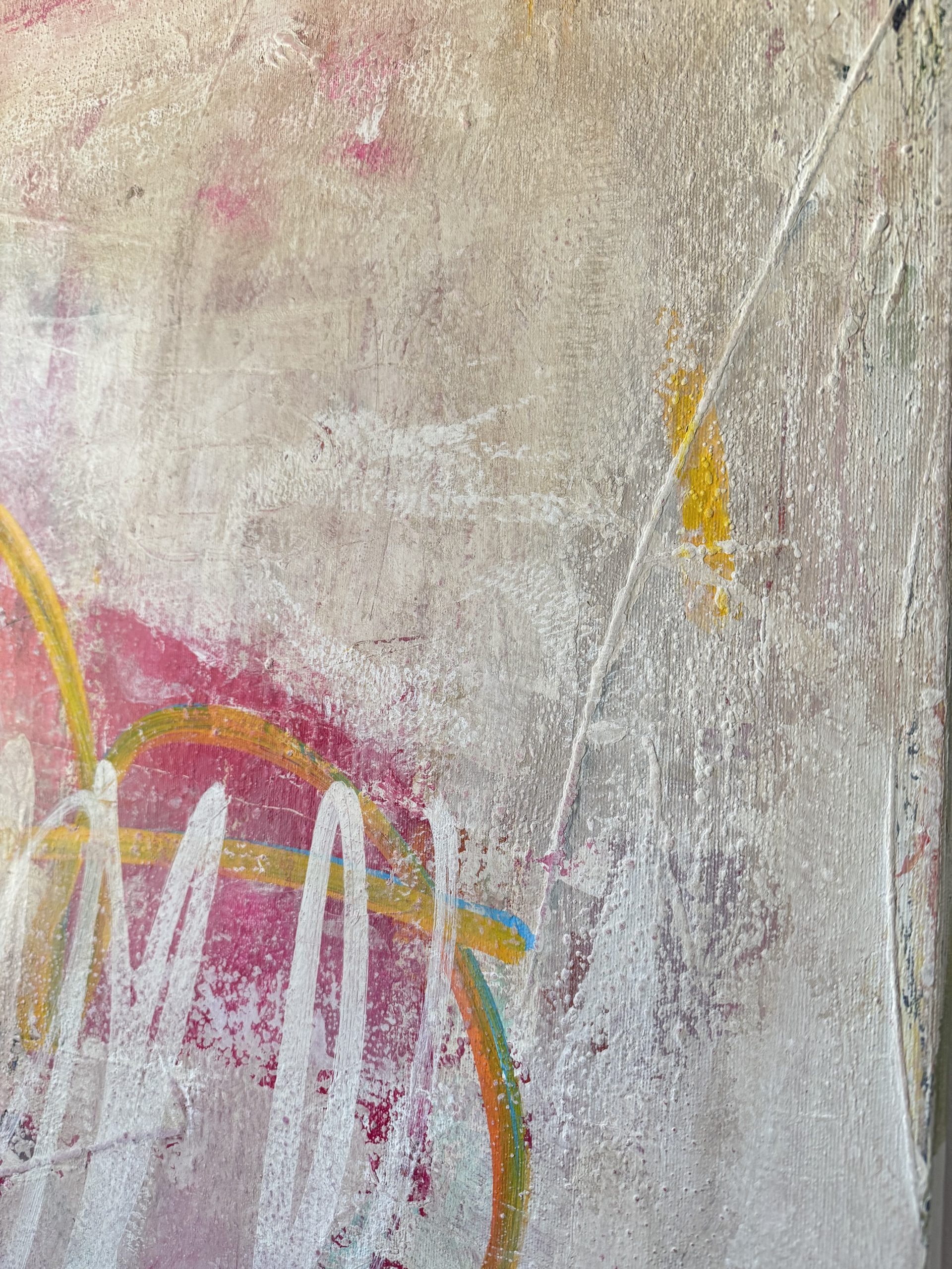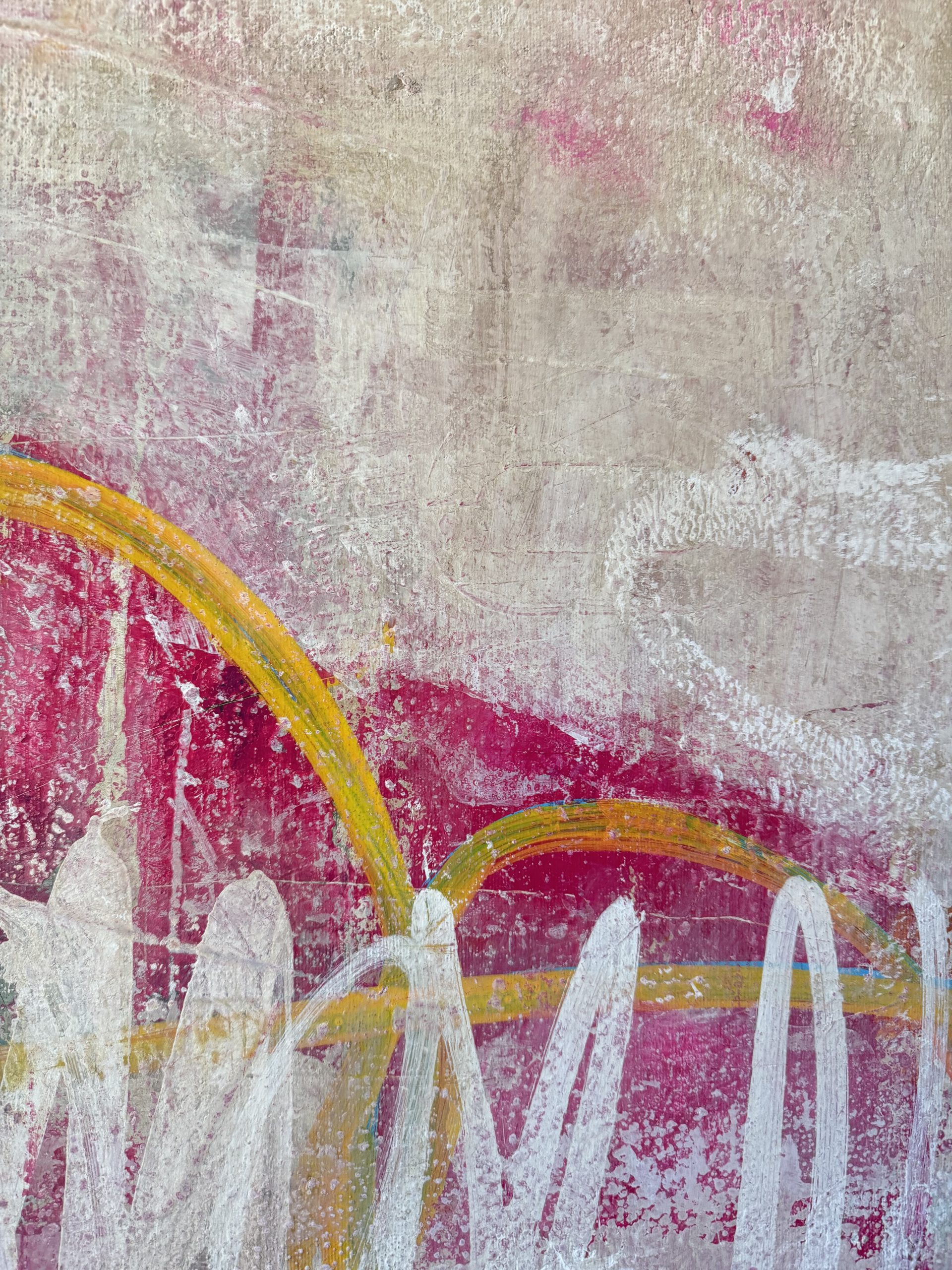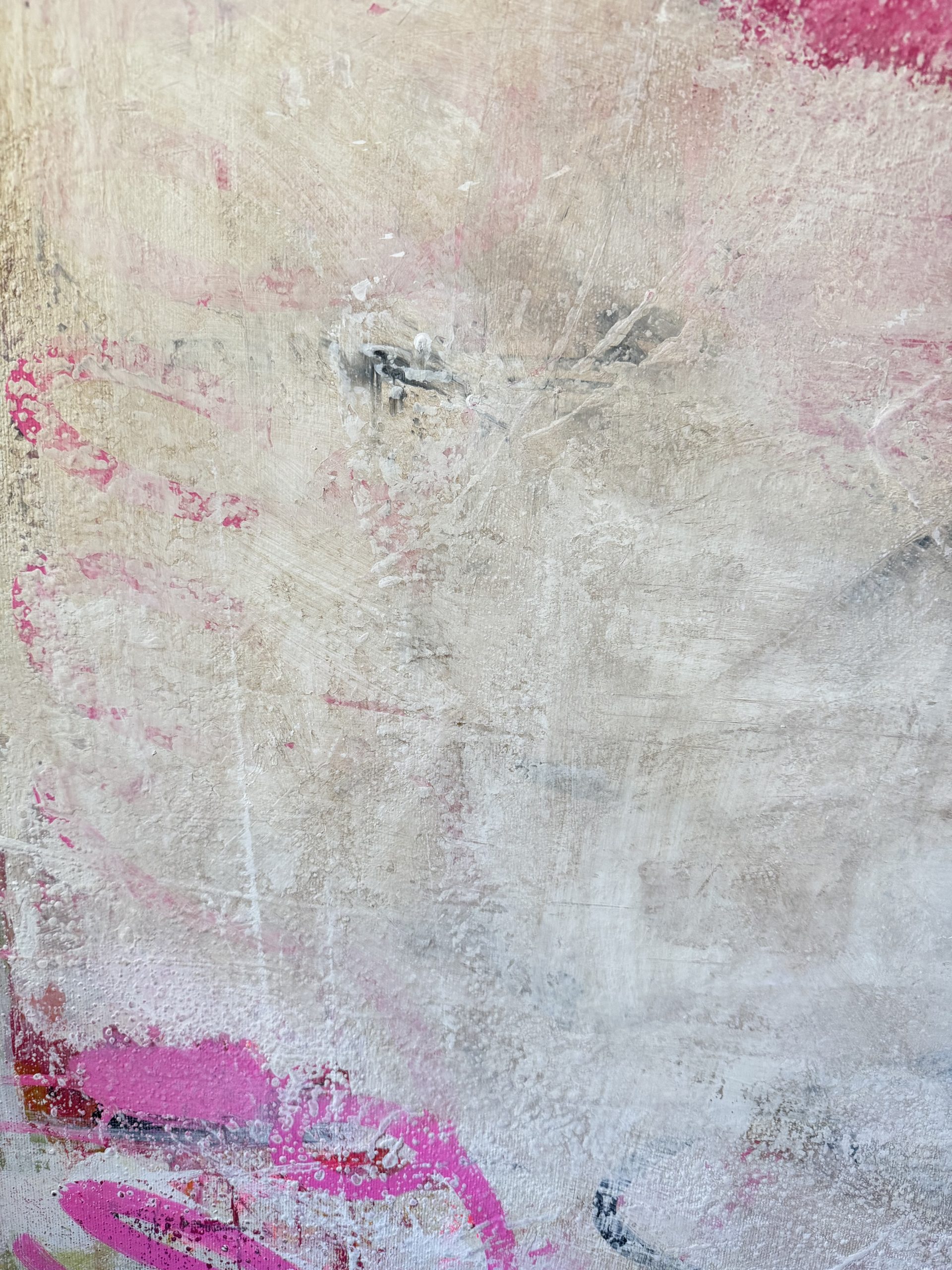 Soft fields of serene background tones and gentle pink clouds hold the memory of childhood joy. Raw scribbles weave through the surface like secret messages, suggesting playfulness, freedom, and the beauty of not knowing exactly where a path leads. The layered textures, subtle scratches and faded edges carry time within them, like echoes of a story still unfolding.