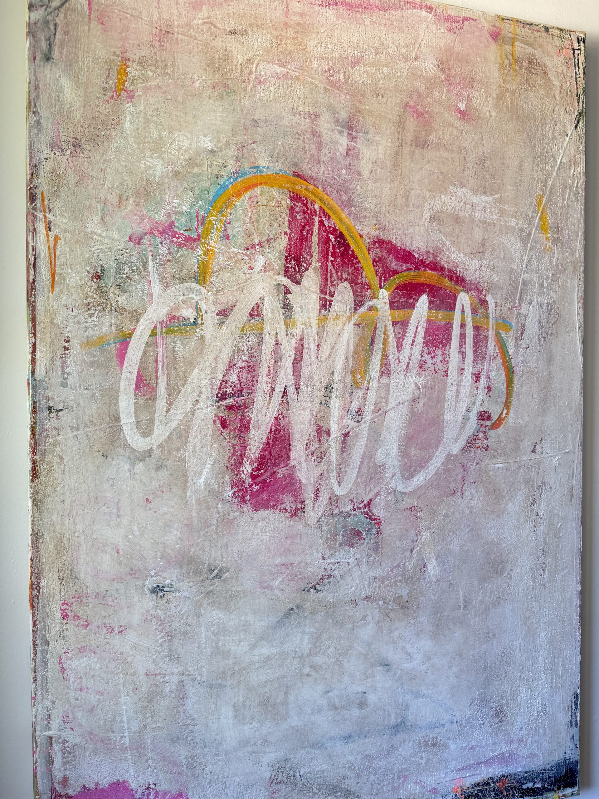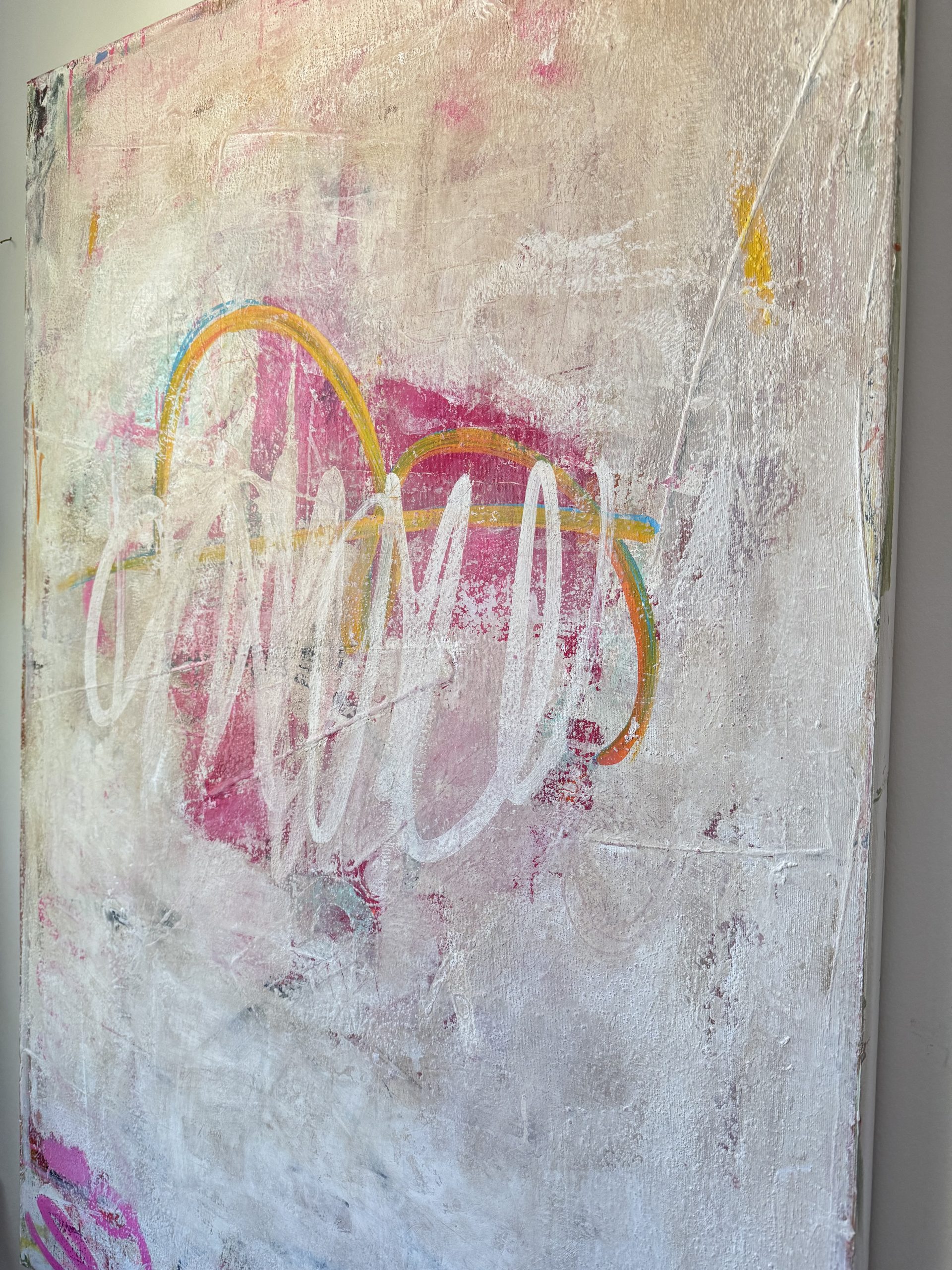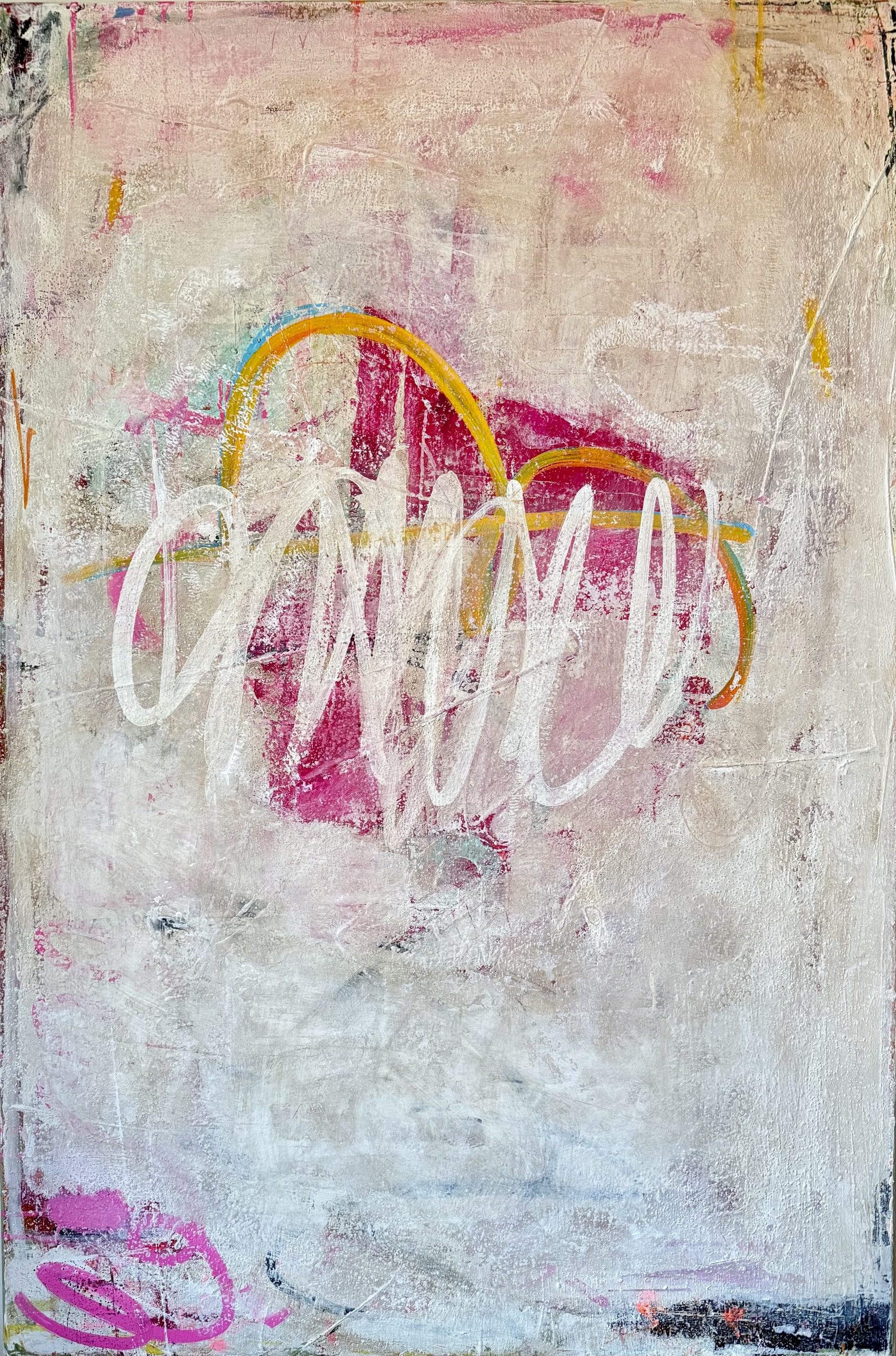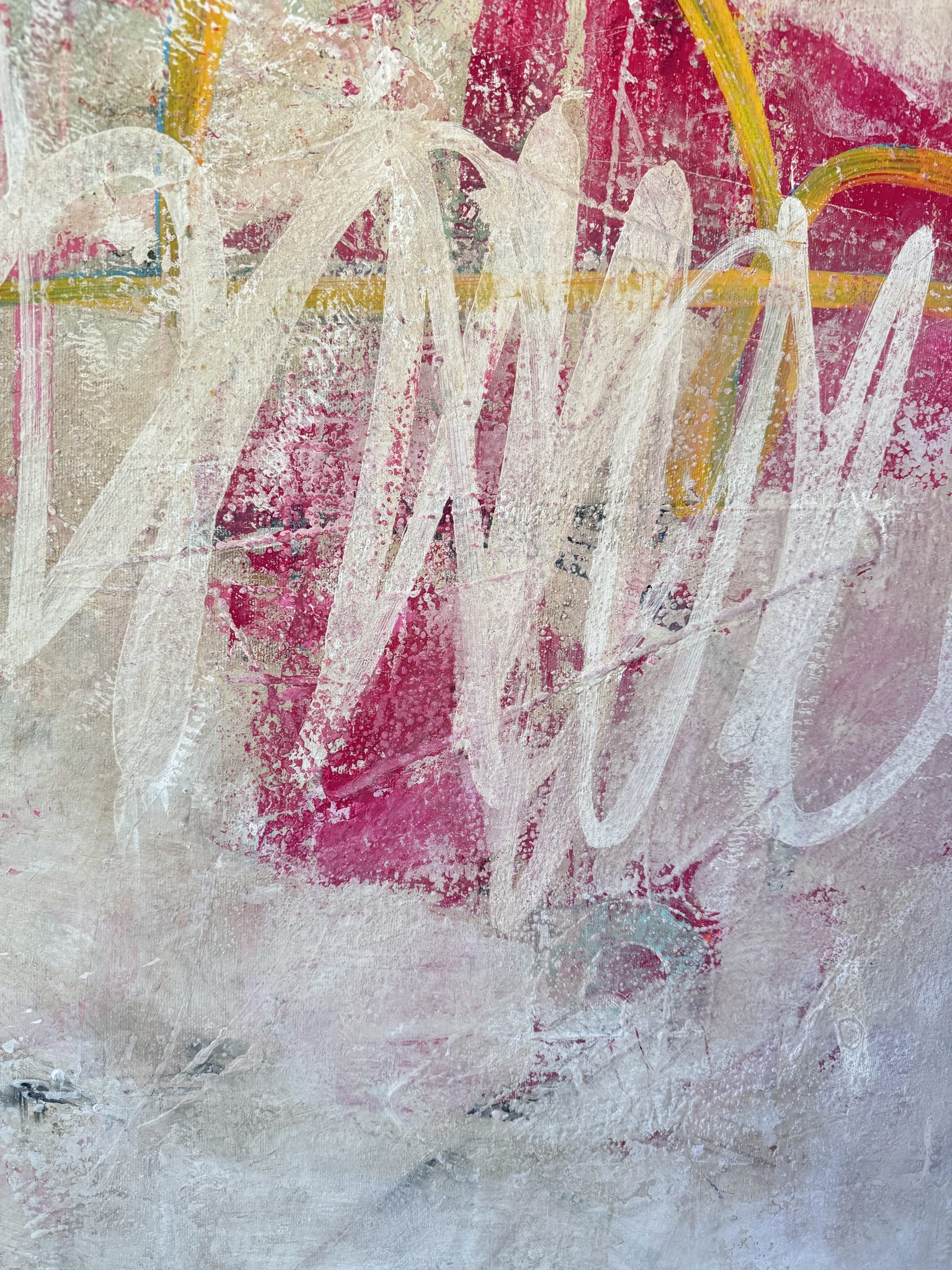Soft fields of serene background tones and gentle pink clouds hold the memory of childhood joy. Raw scribbles weave through the surface like secret messages, suggesting playfulness, freedom, and the beauty of not knowing exactly where a path leads. The layered textures, subtle scratches and faded edges carry time within them, like echoes of a story still unfolding.