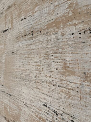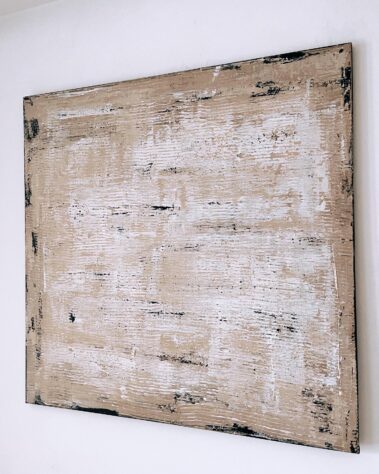 ‘No clichés’, 80×80 cm. The painting embodies a blend of layers and textures — neutral greys, whites, and blacks delicately layered one after another. It’s a choreography of selective textures and contrast, building a vintage wall aesthetic with a touch of a handwritten manuscript. The edges are painted, it is a ready to hang piece.