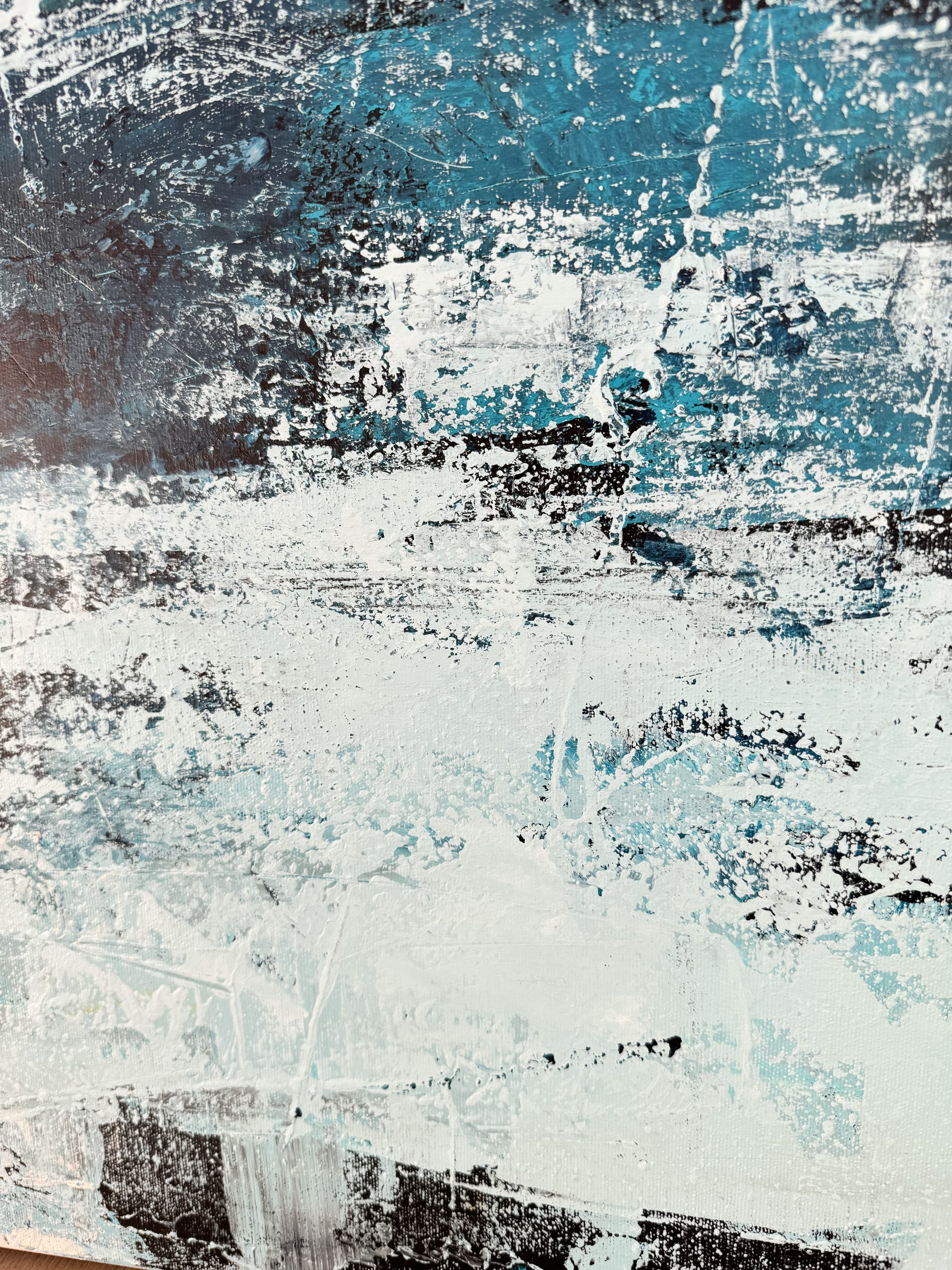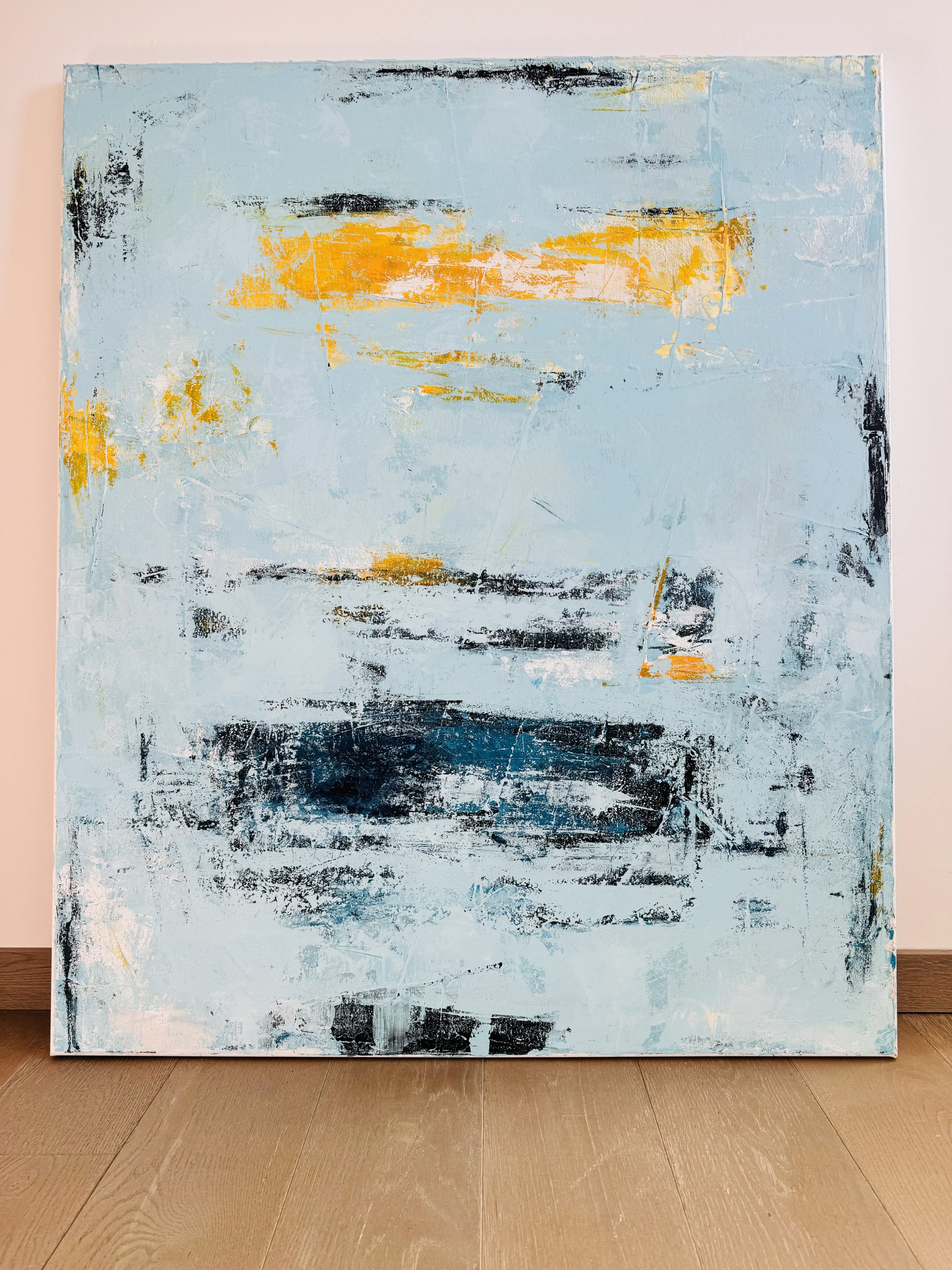 ‘El amor es azul’, 120×100 cm, is my latest abstract piece, inspired by the beautiful complexities of love. The soft, textured blues evoke a sense of calm and serenity, while the streaks of yellow and black hint at the passion and depth that love brings.