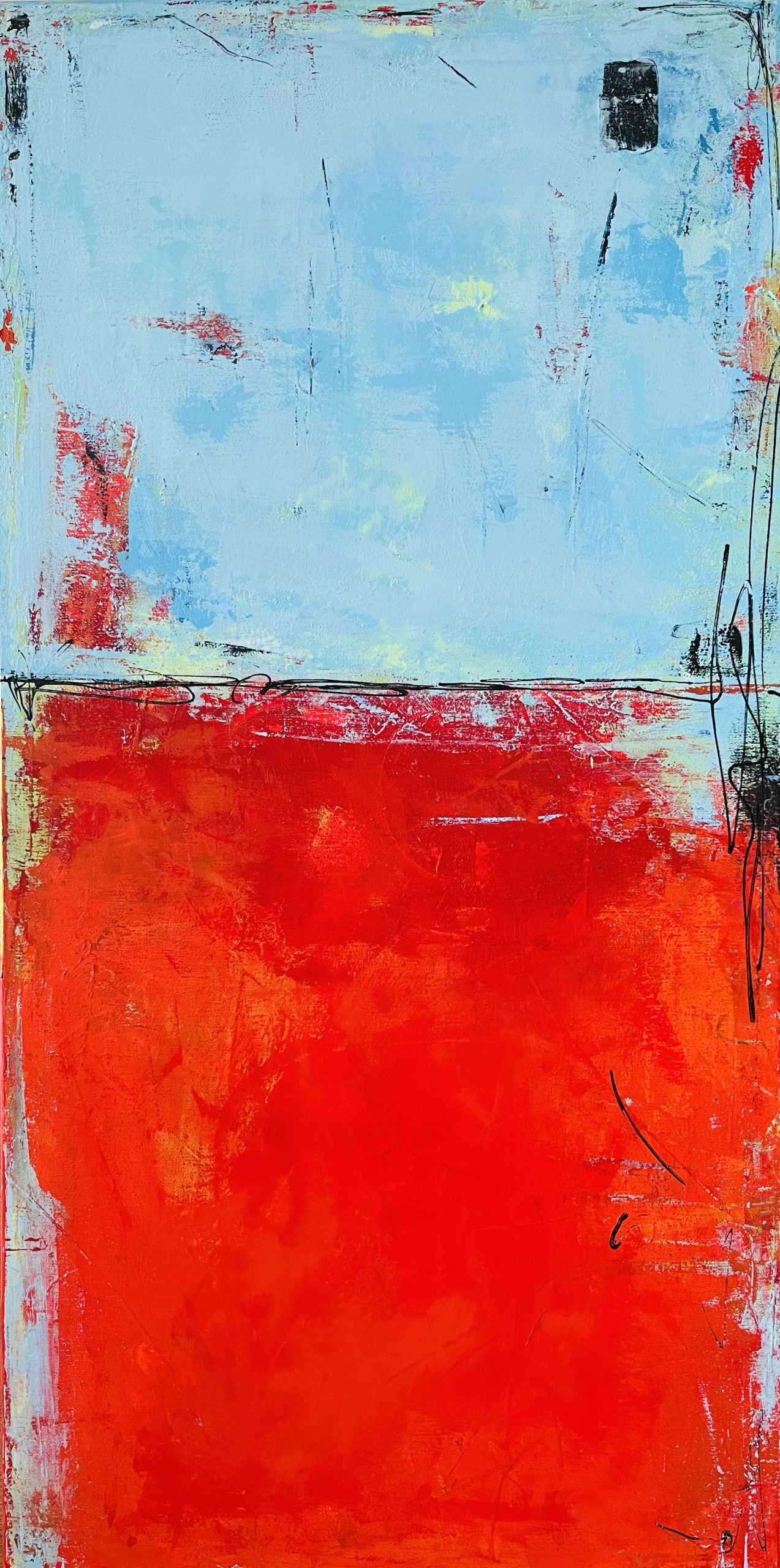 ‘Fire under Water’, 140×70 cm, by Flavia Birsan. Each stroke reveals a dance between opaque and transparent layers, inviting you to unravel its depths. Perfect for modern or romantic interiors, it is a ready-to-hang piece.