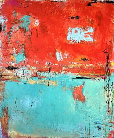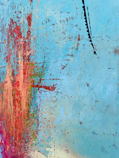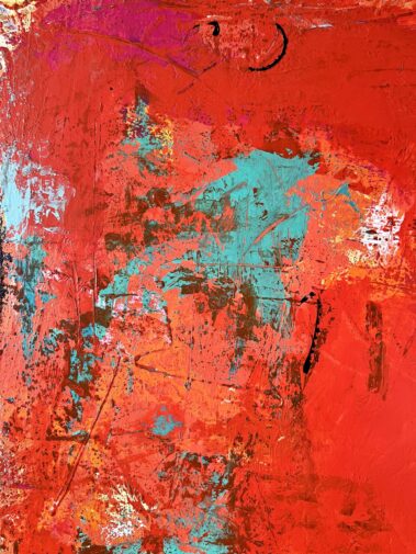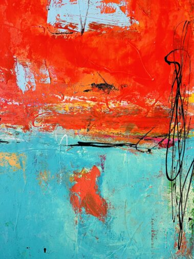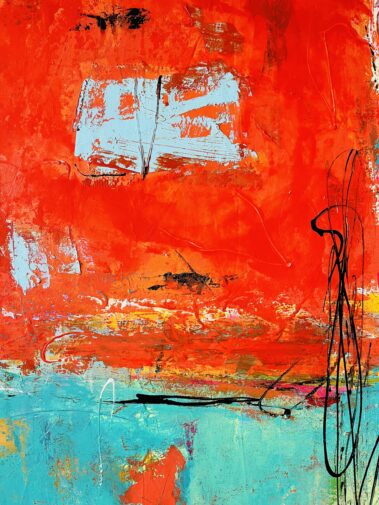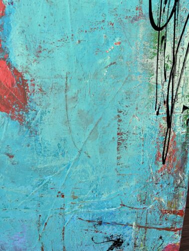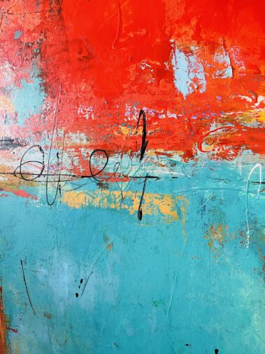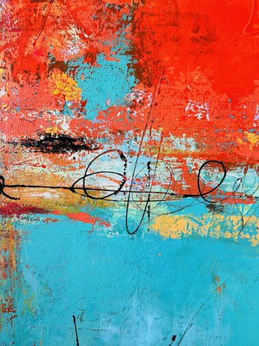 “Living the dream” is an artwork part of ‘Industrial chic’ collection. Flavia Birsan worked on a 120×100 cm canvas mixing bright acrylic colors (turquoise, blue, orange, red). She worked using impasto painting technique, so the artwork has a rich texture. The multiple layers of the painting gives depth and a strong effect. The artwork is a good match for modern or romantic interiors. The sides are painted, so it is a ready to hang piece.