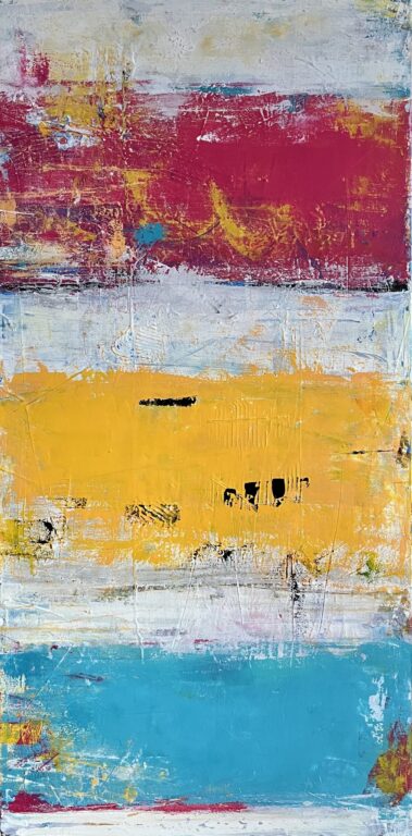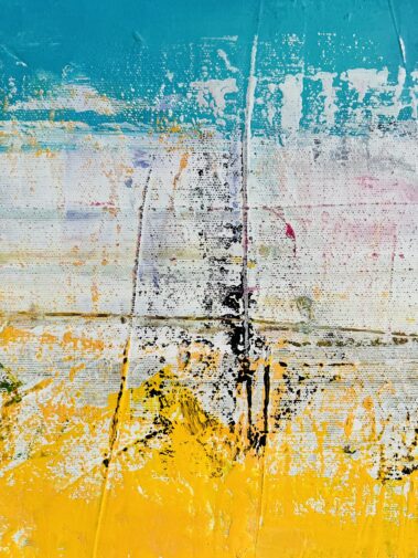 “Outside the line”, by Flavia Birsan, is an artwork measuring 140×70 cm, suitable for tall, slim walls. I worked exclusively with palette knives, creating a textured surface. The colors are rich (magenta, blue turquoise, yellow, cold white) and the multiple layers of the painting gives depth and a strong effect. The piece is ready to hang and the sides are painted.