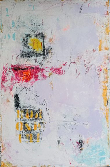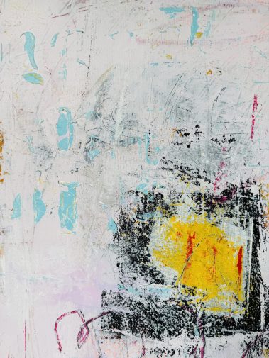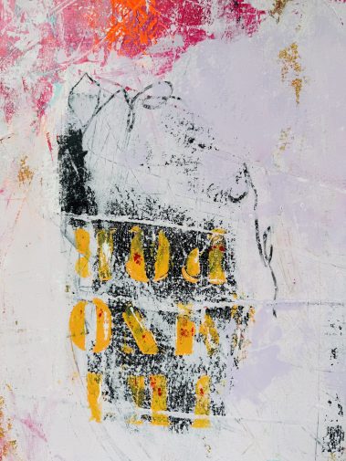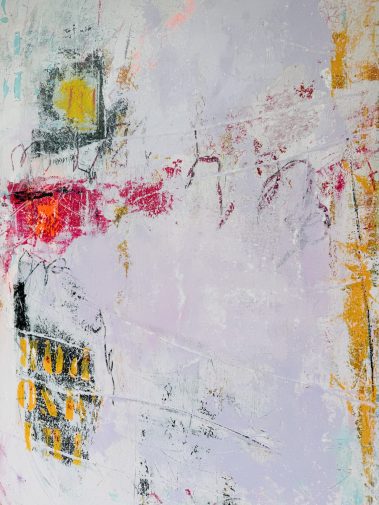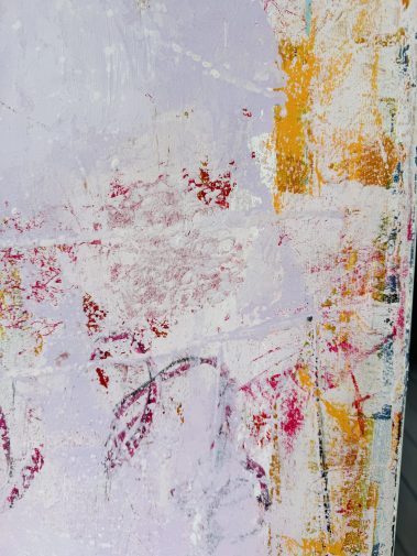 Built in thoughtful layers, this piece blends dusty pinks, faded whites, soft turquoise, joyful orange and a flash of yellow. Each mark was made with an intentional looseness, echoing the way children create, before hesitation, before judgment. The textures are playful yet grounded, like a memory both distant and deeply familiar.